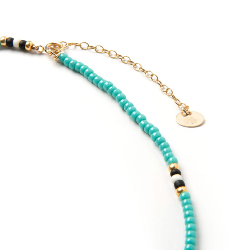 Featuring glass beads in turquoise interspersed with black, white and gold, our choker-style necklace provides a summer colour pop.