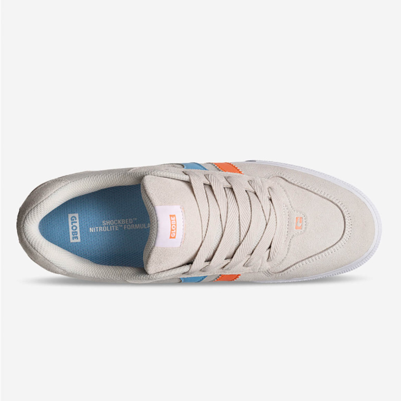 The Encore 2 in Cloud/Blue/Orange is a classic vulcanised skate style with twin design stripes, full length herringbone outsole pattern and triple stitch toe cap.