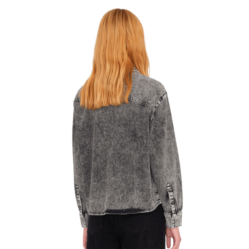 Metallic ring snap buttons at front and cuffs